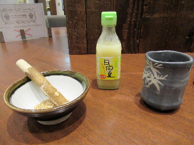 胡麻とご飯、みそ汁、漬物がセットになっている。