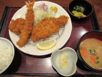 ごちそうランチは海老フライ、ヒレカツ、ロースカツのセットで、