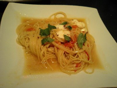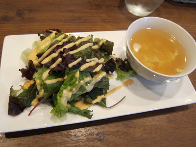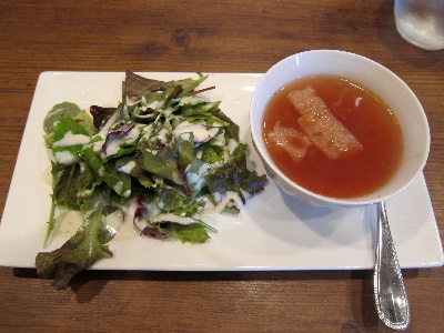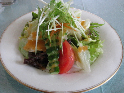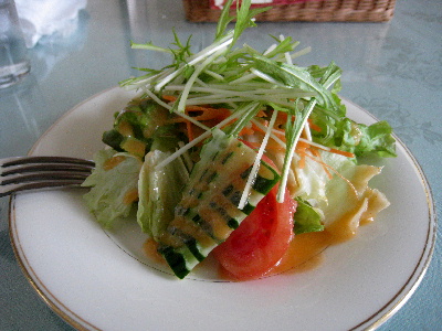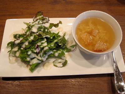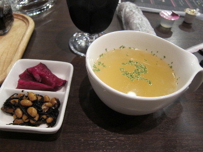 最初にお茶と日向夏みかんドレッシングが運ばれてきた。