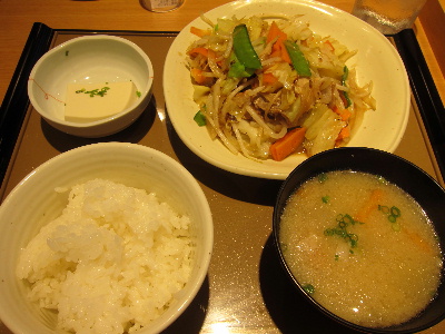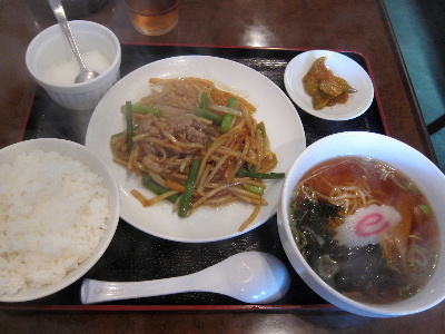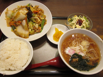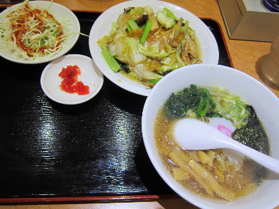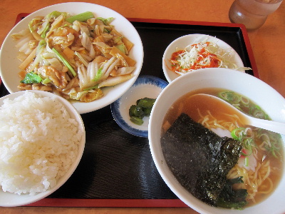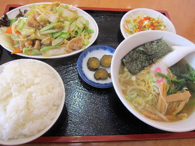 回鍋肉に醤油ラーメン、大盛のライス、サラダ、お新香のセットである。