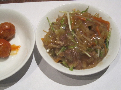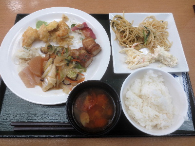 続いて肉料理で唐揚げや焼肉、それに魚のフライのようなもの。