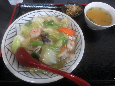 塩ベースの中華あんで白菜が中心の野菜に豚肉や海老なども入っている。