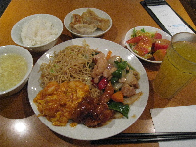 酢豚、えびと玉子のチリソース煮、牛肉のオイスター炒め、焼きそば、餃子、サラダ、玉子スープなど。